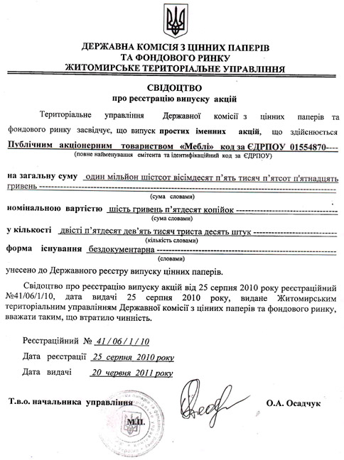 Свідоцтво про державну реєстрацію випуску акцій Товариства